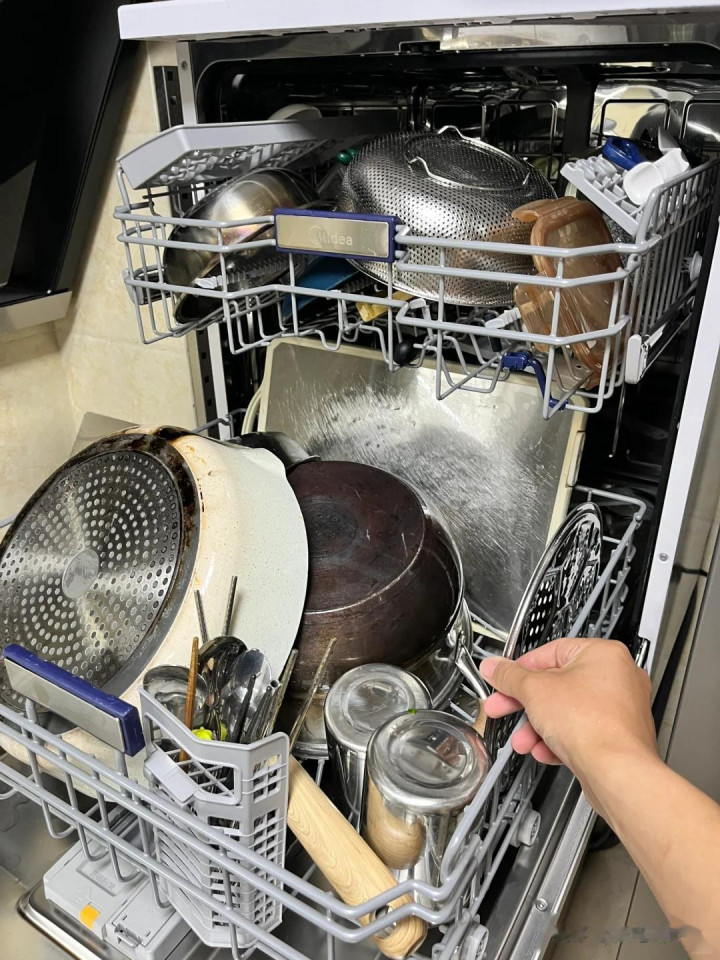 而且洗碗机不像我想象中的那么简单省事,用之前必须提前冲洗干净厨具和餐具上面的垃圾,要按照使用说明放,才有可能洗的干净,不会出现残留、厨余垃圾堵塞排水口的情况。
